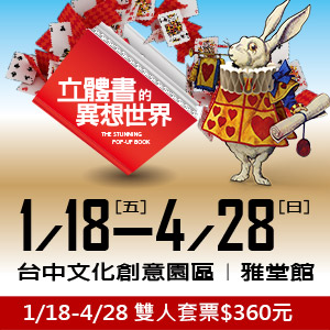 本 次台中主題展,以「愛麗絲夢遊仙境」的故事主軸,讓民眾除了可以深入了解立體書的歷史、演變,欣賞到世界各地的立體書代表作品,此外還能感受到每本書的作 者創作的巧思,進入作者創作的想像空間;你可以回到維多利亞女王時代,遊覽哥德式與巴洛克式建築的美麗,或者跟著美國紙藝大師大衛‧卡特一起探討幾何美感 的奧妙。在立體書的異想世界裡,處處都有意想不到的驚喜。本展展出150件各式立體書包含娃娃屋書、劇場書、隧道書等國內外精彩作品外以及多本獲得立體書 奧卡梅根多佛獎(Meggendorfer Prize)的得獎作品,要你進入一場異想世界之旅,感受立體書的精彩與感動!